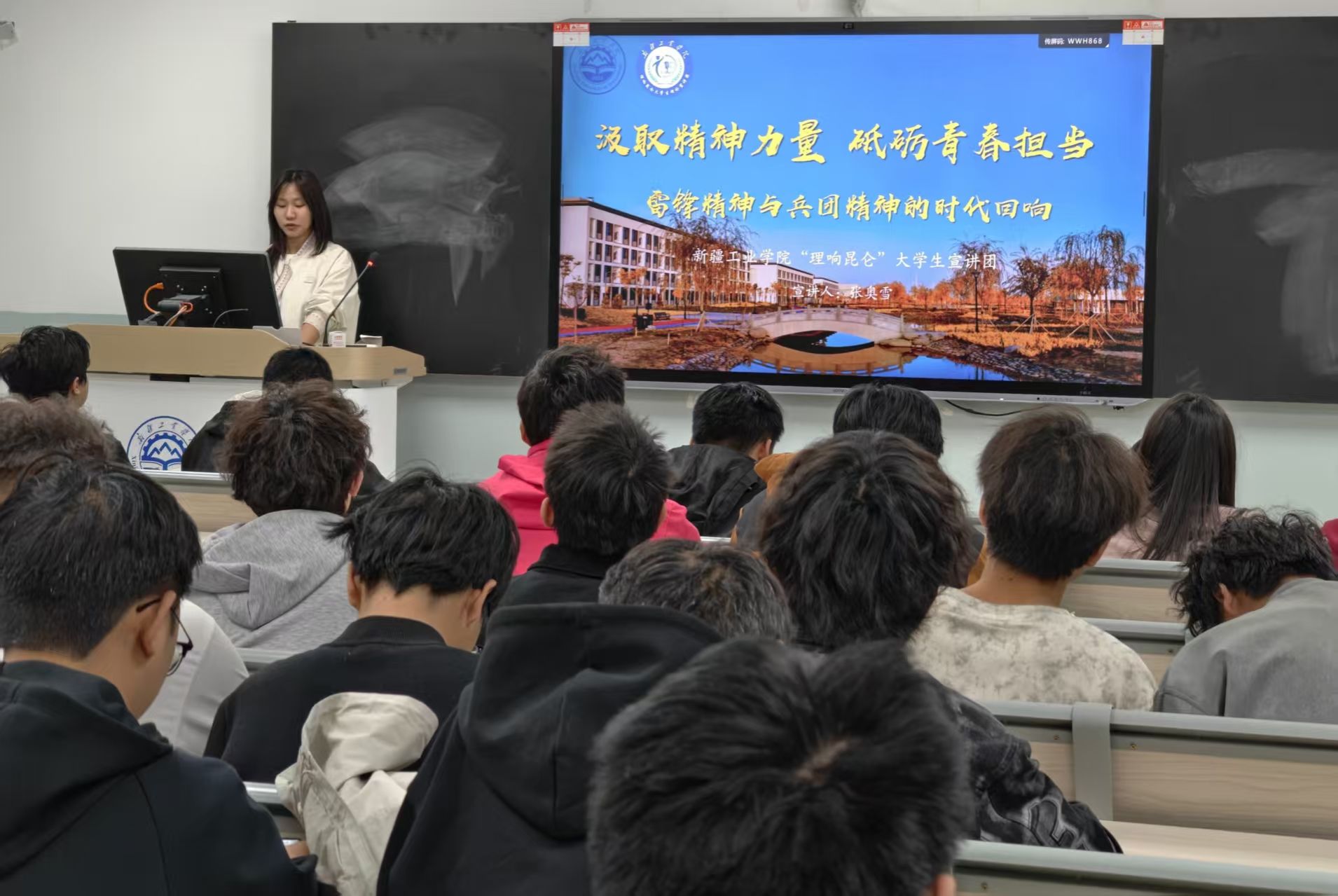 宣讲团结合学校办学特色与新疆地域特点,深入剖析两大精神同源同向的价值底色——二者皆以家国情怀为根本、以无私奉献为核心、以奋斗实干为追求,更是将学校153天拔地而起的奋斗故事、兵团前辈屯垦戍边的坚守事迹与本校学子践行雷锋精神的志愿服务案例相结合,清晰阐释了雷锋精神在边疆的时代诠释,以及兵团精神对雷锋精神的传承与升华,让同学们深刻理解作为新时代新工学子,传承两种精神就是要把个人理想融入西部建设、新疆发展的大局中。