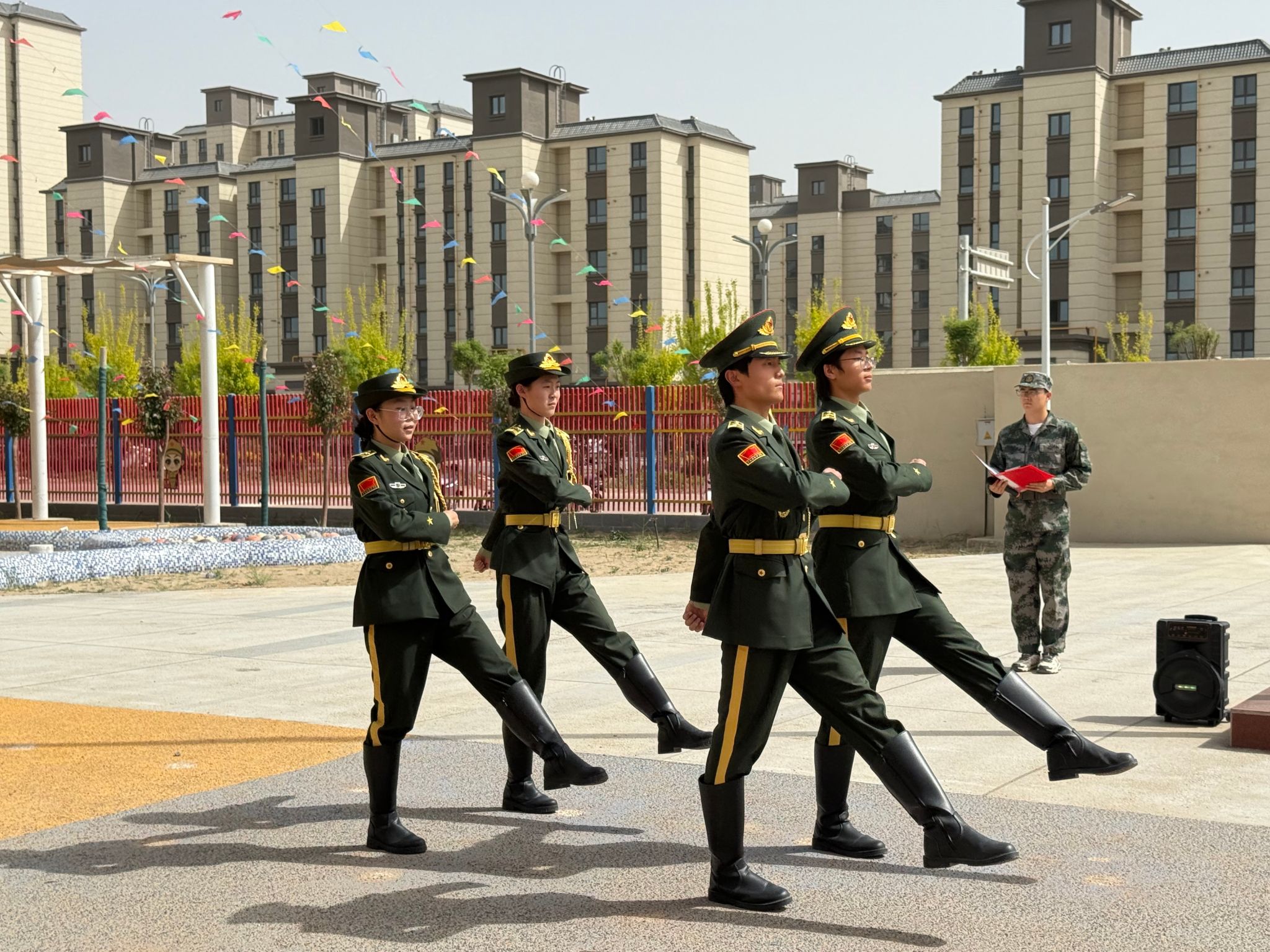 活动伊始,宣讲团开展国旗下爱国主义宣讲,传递红色理念。随后,新疆工业学院国旗护卫队代表身着整齐制服,依次进行标准列队、铿锵齐步走、威武正步走展示,挺拔的身姿、整齐划一的步伐、昂扬向上的精神风貌,赢得现场师生阵阵掌声,让爱国种子在孩子们心中悄然扎根。