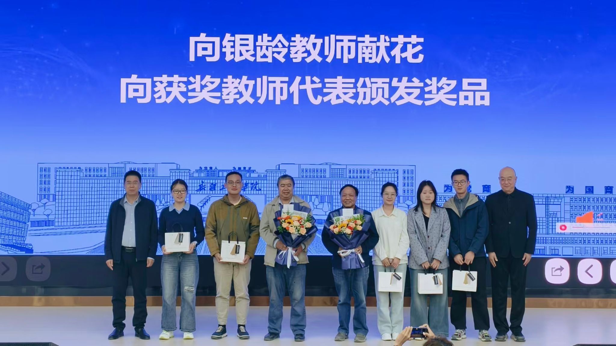 王军对学院工作做阶段性总结,宣读了近期在教学竞赛、科研立项、论文发表等方面的突出成绩。院领导对邱爱雅、刘笑等获奖教师代表予以表彰,并向银龄教师献花致敬,充分肯定了他们为学院发展作出的突出贡献。