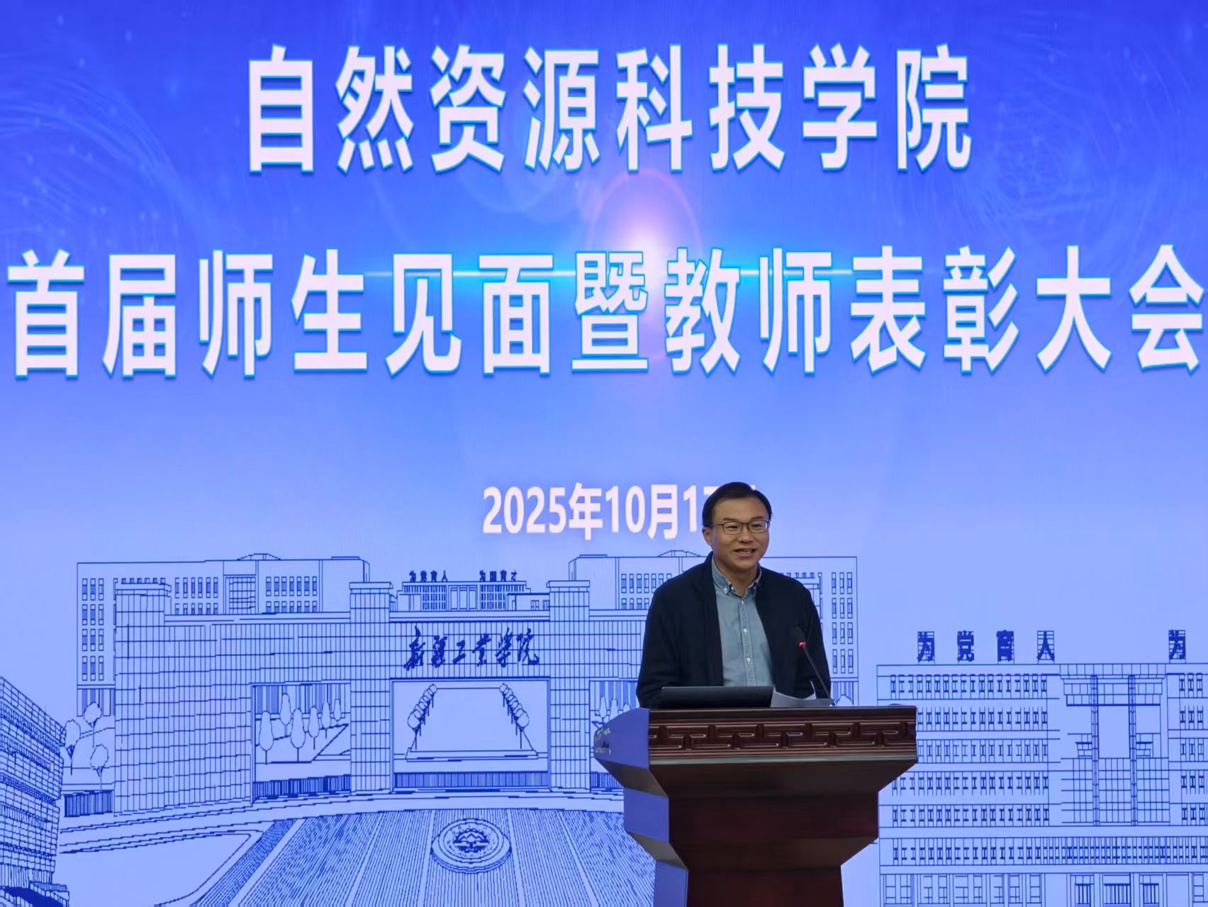 2025年10月17日晚,新疆工业学院自然资源科技学院首届师生见面暨教师表彰大会在学术报告厅顺利举行。校党委常委、副校长侯志军,学院党委书记王军、院长苏玉平,全体教师及2025级467名新生共同参加了这场以“携手新起点,共绘山河图”为主题的大会。会议由学院党委副书记贺运政主持。
