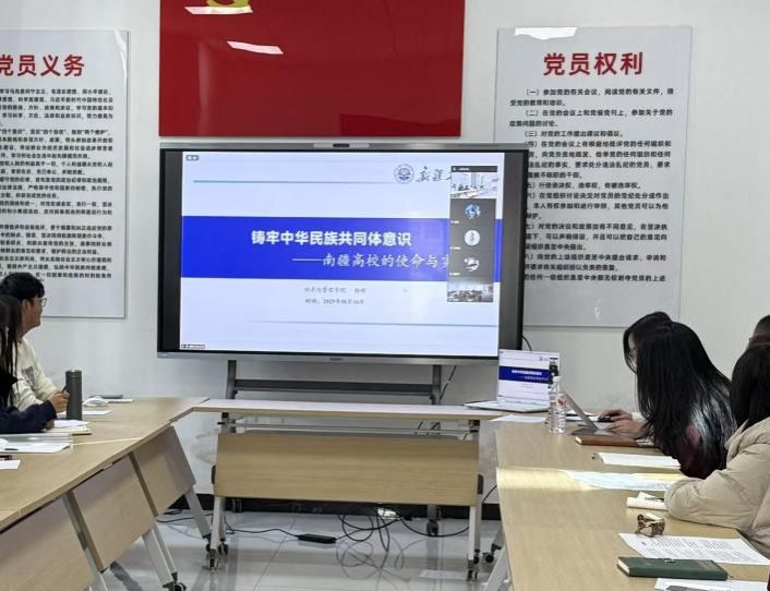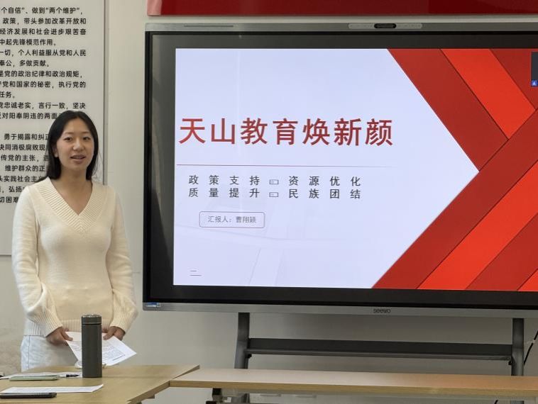 围绕“铸牢中华民族共同体意识”主题,辅导员杨婷老师围绕“共同体的根基、内涵、新时代共同体的实践以及共同体的时代责任”结合南疆高校实际,为大家讲解南疆高校青年学子该如何践行“铸牢中华民族共同体意识”。她以具体案例说明,南疆高校通过课程思政、实践研学、文化交流等多种形式,已成为铸牢中华民族共同体意识的“桥头堡”,为推动南疆高质量发展注入了青春力量。