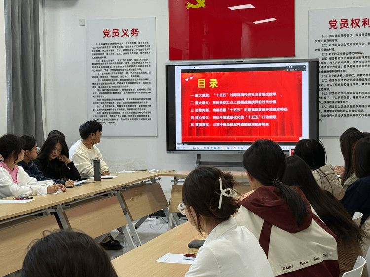 活动伊始,李雪松老师以“党的二十届四中全会精神解读”为核心,系统介绍了中国共产党第二十届中央委员会第四次全体会议的背景与意义。在此基础上,李老师重点拆解了“十五五”时期的行动纲领,围绕“一个引领,六大原则,七方面目标,十二项重要部署,一个保障”的逻辑体系,深入浅出地阐释了中国式现代化的核心要义。她强调,“十五五”规划是未来五年国家发展的“任务书”与“路线图”,青年一代需深刻把握其梯次推进的目标体系,将个人成长融入国家发展大局。
