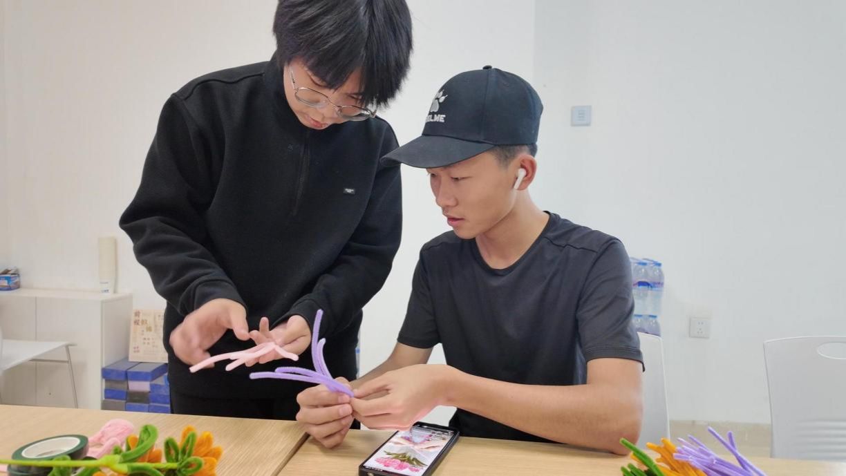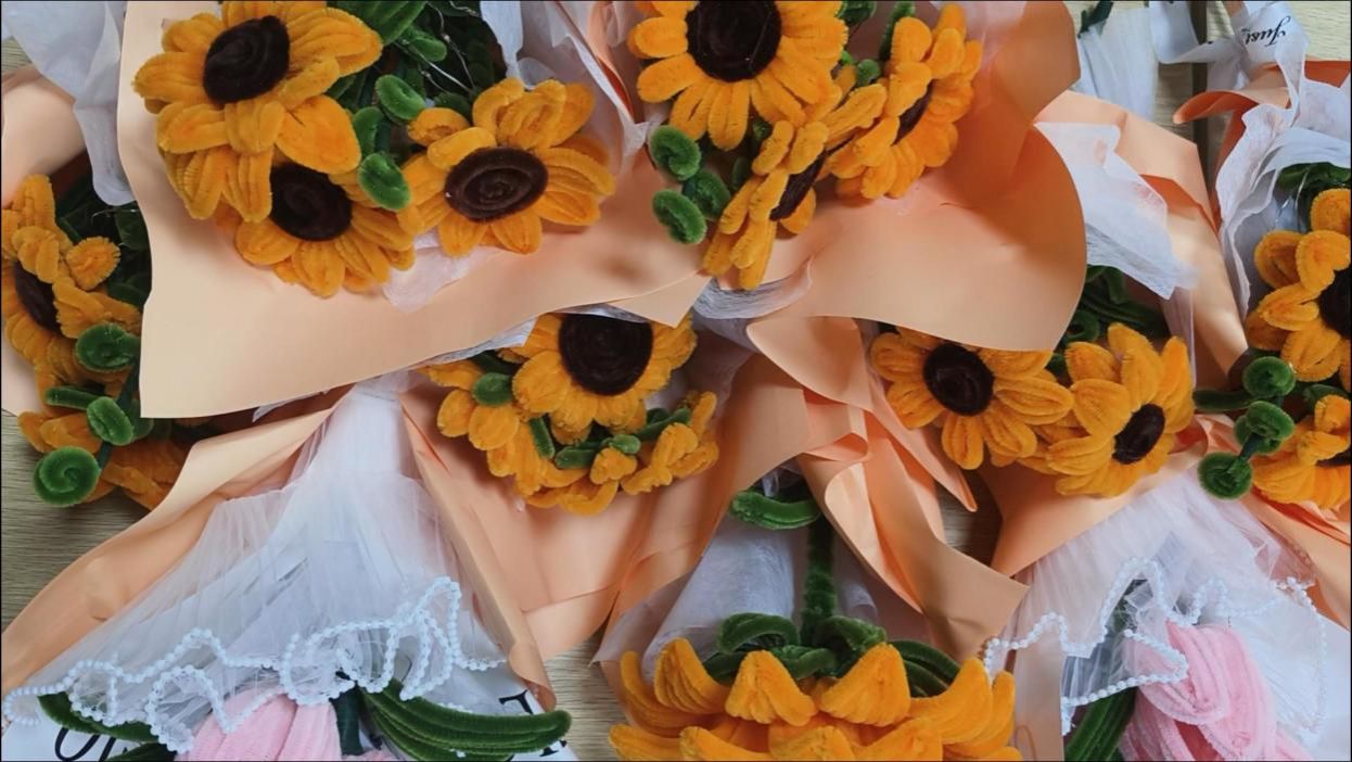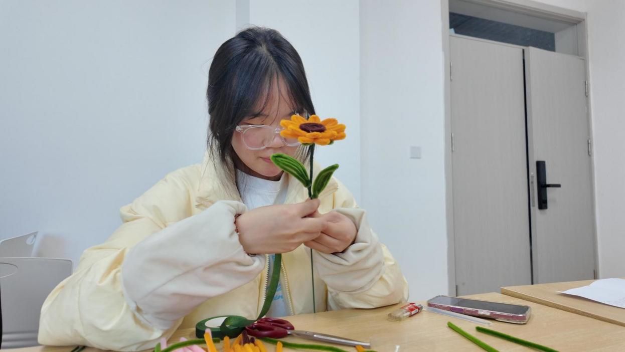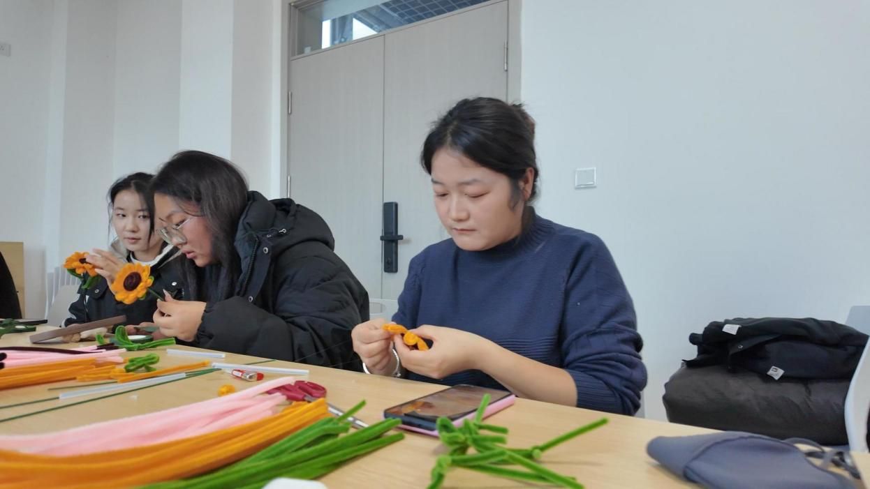 矿物加工专业的陈子豪同学化身“花艺小老师”,从向日葵花瓣塑形到康乃馨褶皱缠绕,每一步都讲得明明白白~遇到动手慢的同学,他还一对一帮扶:“这个花瓣扭紧点才立体~”“胶水涂这里更牢固哦!”保证每个人都能做出美美的花束~