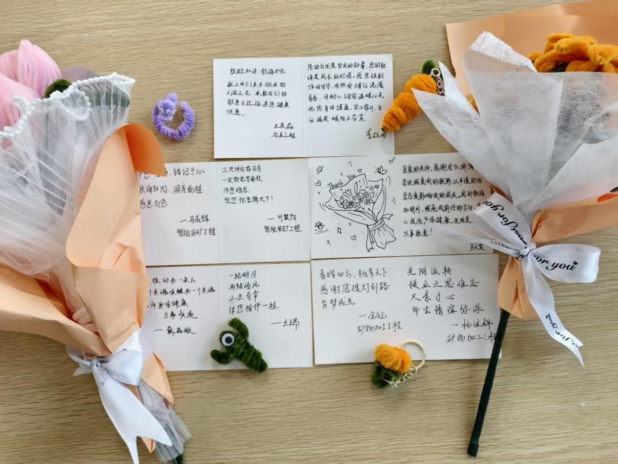 做完花束,大家拿起精致贺卡,写下心里话:“春晖四方,桃李天下,感谢您提灯引路,育梦成光”字里行间都是藏不住的感恩~
