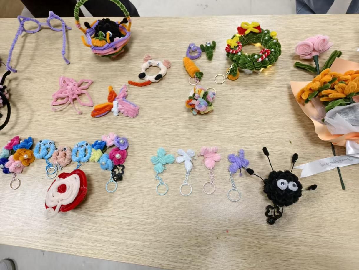 自主创作环节直接开启脑洞狂欢模式!有人捏出圆滚滚的小毛球,有人拼出振翅欲飞的蝴蝶,还有人做了缀着星星的花束……每个作品都像装着专属小宇宙,把奇思妙想和悄悄藏的心意全揉进了手工里~