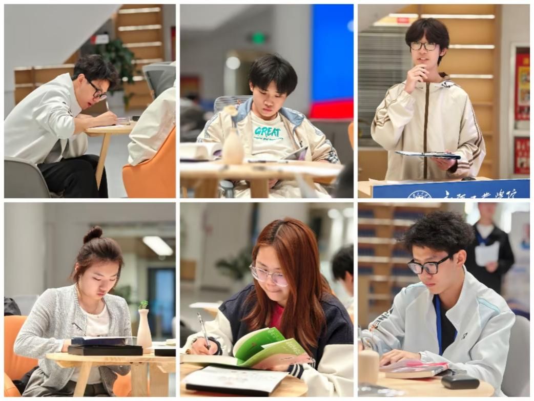 同学们在图书馆阅览区自由选书,书目涵盖文学、哲学、历史等多个类别,大家安静就座,沉浸式阅读,现场只闻翻书轻响,氛围宁静而专注。