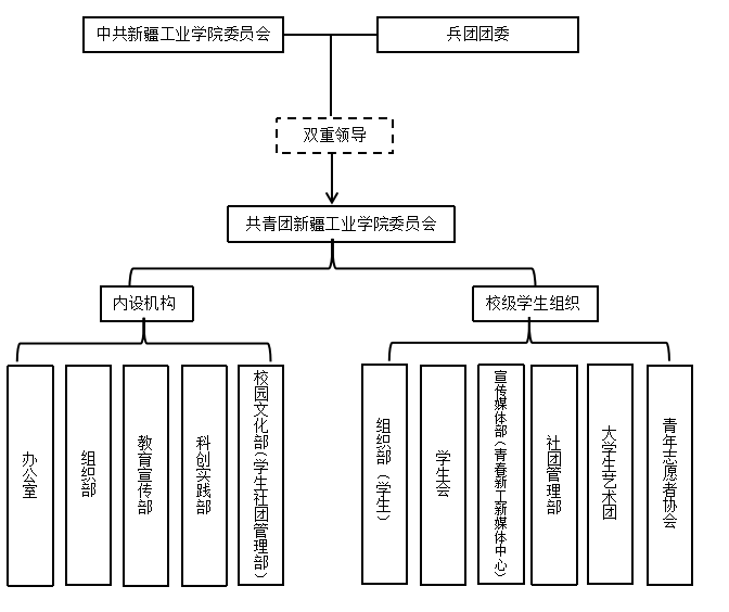 共青团新疆工业学院委员会(以下简称“校团委”)是在校党委和上级团组织领导下的先进青年群团组织,承担基层团组织建设,“网上共青团”建设,青年思想引领、社会实践、文体活动、志愿服务、社团管理、骨干培养、理论研究等专项工作;下设办公室、组织部、宣传教育部、科创实践部与校园文化部(学生社团管理部)5个职能部门,指导6个团学组织,各部门根据工作职责各司其职、各负其责,共同保障校团委的各项工作正常运行。