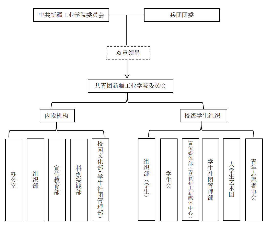 共青团新疆工业学院委员会(以下简称“校团委”)是在校党委和上级团组织领导下的先进青年群团组织,承担基层团组织建设,“网上共青团”建设,青年思想引领、社会实践、文体活动、志愿服务、社团管理、骨干培养、理论研究等专项工作;下设办公室、组织部、宣传教育部、科创实践部与校园文化部(学生社团管理部)5个职能部门,指导6个团学组织,各部门根据工作职责各司其职、各负其责,共同保障校团委的各项工作正常运行。![]()